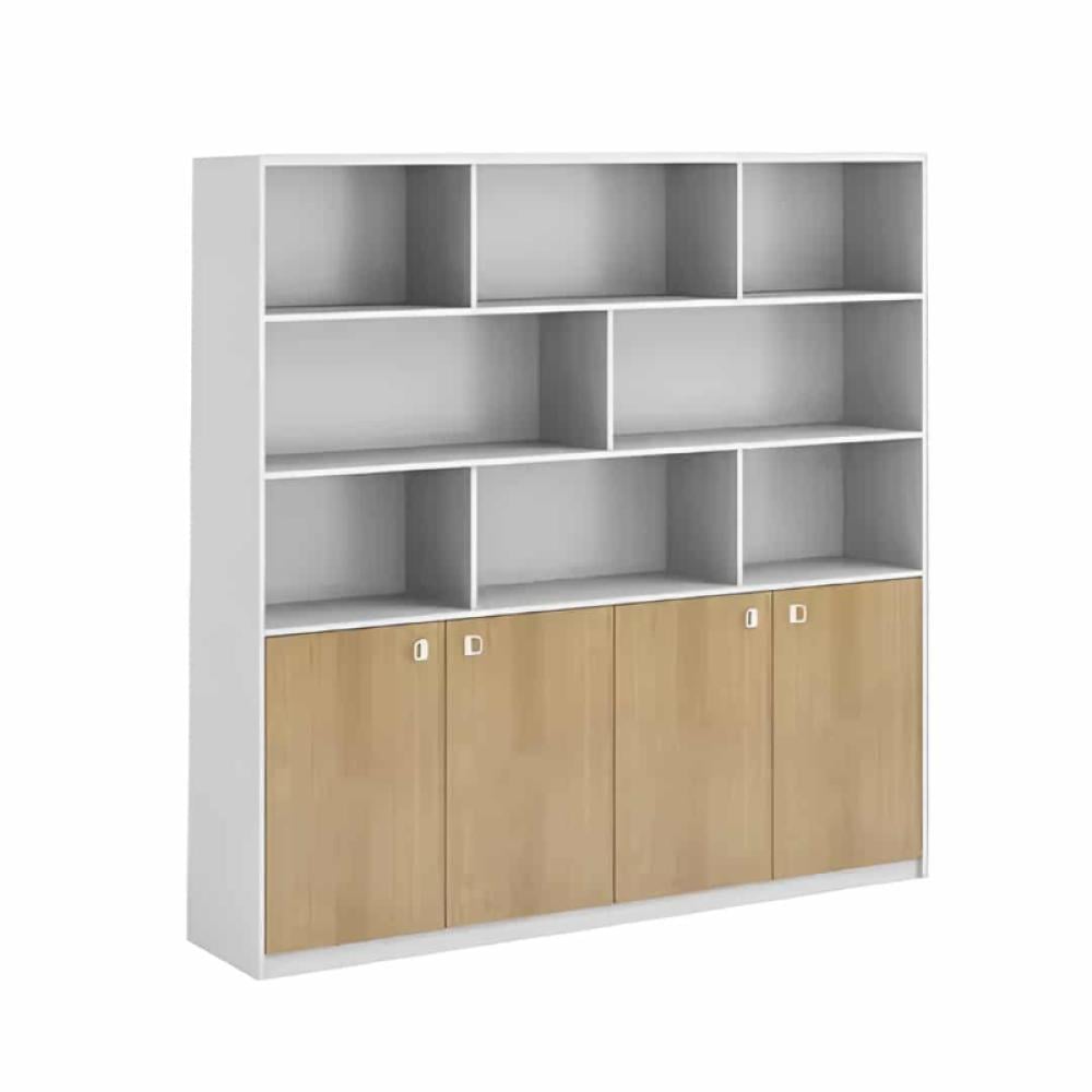 - مكتبة مكتب مودرن صنعت من خشب ال ام دي اف التركي من اللون الابيض مع الخشبي تتناسب مع ديكورات مكتبك الحديث بها العديد من الارفف يمكن استخدامهم لتنظيم ملفاتك المكتبية او لعرض التحف الديكورية المميزة لديك