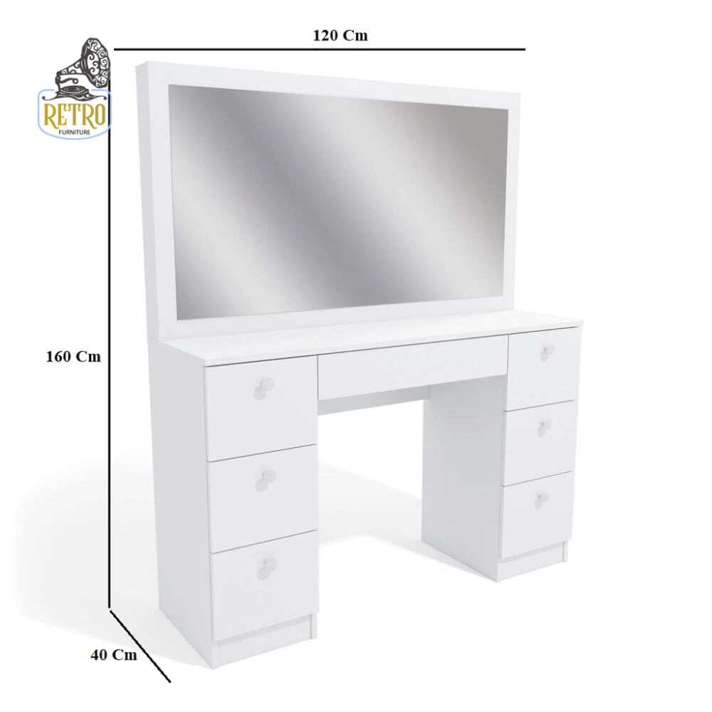 تسريحة بمرايا مصنوعة من خشب مُصنع اتحاد اوروبي مكونة من 6 أدراج على الجانبين ودرج كبير في الوسط.الخامات :خشب MDFالمقاسات :العرض 120سم – الإرتفاع 160سم – العمق 40سماللون : أبيض